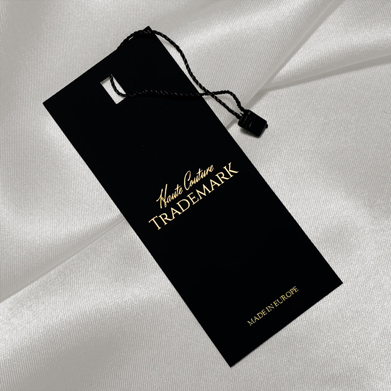 Etiqueta negra con escritura dorada fabricada en cartón grueso laminado Soft Touch, con cordón y sello de plástico incluido, para diversos productos de confección. Este modelo de etiqueta está hecho de materiales de alta calidad, utilizando las tecnologías más avanzadas en el campo de la impresión digital y el acabado.