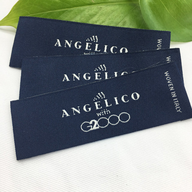 Etiqueta tejida con bordes doblados, modelo Elegant Style, diseñado en un material textil, personalizada con inscripciones bordados. Este modelo de etiqueta textil está hecho de materiales de alta calidad, utilizando las tecnologías más avanzadas en el campo del bordado digital a nivel industrial.